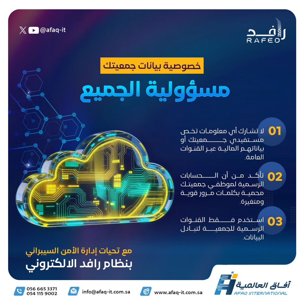 فى الأونة الأخيرة اعتمد كثير من الجمعيات نظام رافد الذى يعد نقطة تحول فى الميدان الخيرى حيث هو لبنة مهمة جدا فى تاريخ التحول التقنى إذ يعتمد على فريق دعم محترم يقدم أفضل الحلول ومخططات سير العمليات وتوزيع المهام واعتمادها وهى التى من خلالها استطعنا تحقيق نجاحات متميزة فى الموارد المالية وفى إدارة الخدمة المجتمعية وفى ضبط إدارة الموارد البشرية وتنظيمها.